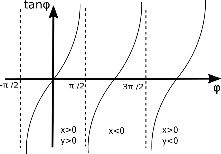 It is not surprising that this solution involves the inverse of the tangent, arctan. The additional term kπ comes from the fact that tangent is a π-periodic function with several branches. Depending on the region of the complex plane, different branches apply. For example let’s say the point z is in the left half of the comlex plane, meaning x<0. In this case, the angle φ is somewhere between π/2 (90°) and 3π/2 (270°). (Notice that these two angles are precisely the exceptions corresponding to x=0. Here the tangent function diverges.) As we see in the picture in the right-hand side, the second branch of the tangent applies for this region of the complex plane. So after inverting the first branch and arriving at arctan, we still need to add π in order to arrive at the correct value of φ. This is the case of k=1.